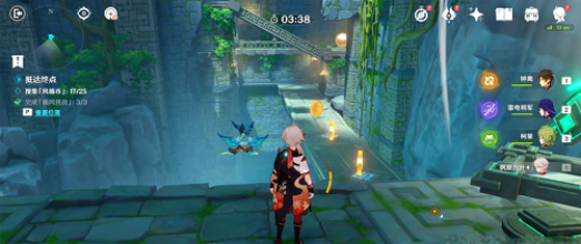 6.来到任务指引处,将左下方的风场方向朝上,并鼓动风场,按照图中箭头方向收集风循币并前进。到达终点,完成。