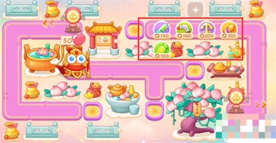4、之后放置好下图的炮塔之后就打蟠桃树,利用溅射开图,有钱就放置船锚和烟花。
