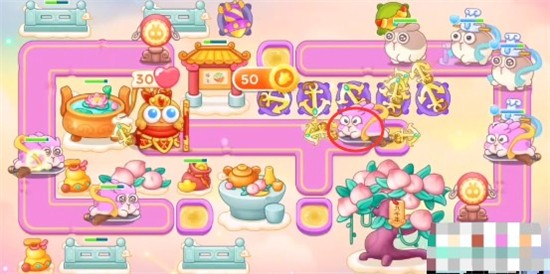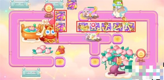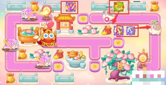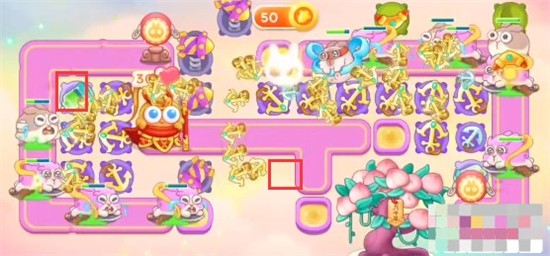 1、本关能够使用的炮塔是:毒针、回旋镖、船锚、烟花、普通炮,我们这一关使用船锚和回旋镖输出。