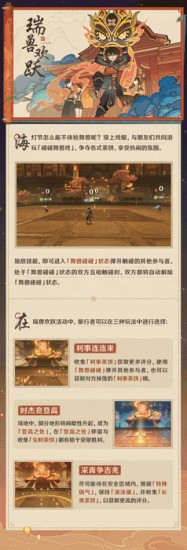 活动期间,旅行者可以参与[纸影寻肴]、[瑞兽欢跃]、[熠光云行]各阶段玩法积累节庆热度。