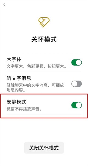 在iOS微信更新到最新版本,通过“微信”-“我”-“设置”-“关怀模式”-“安静模式”,就能开启。